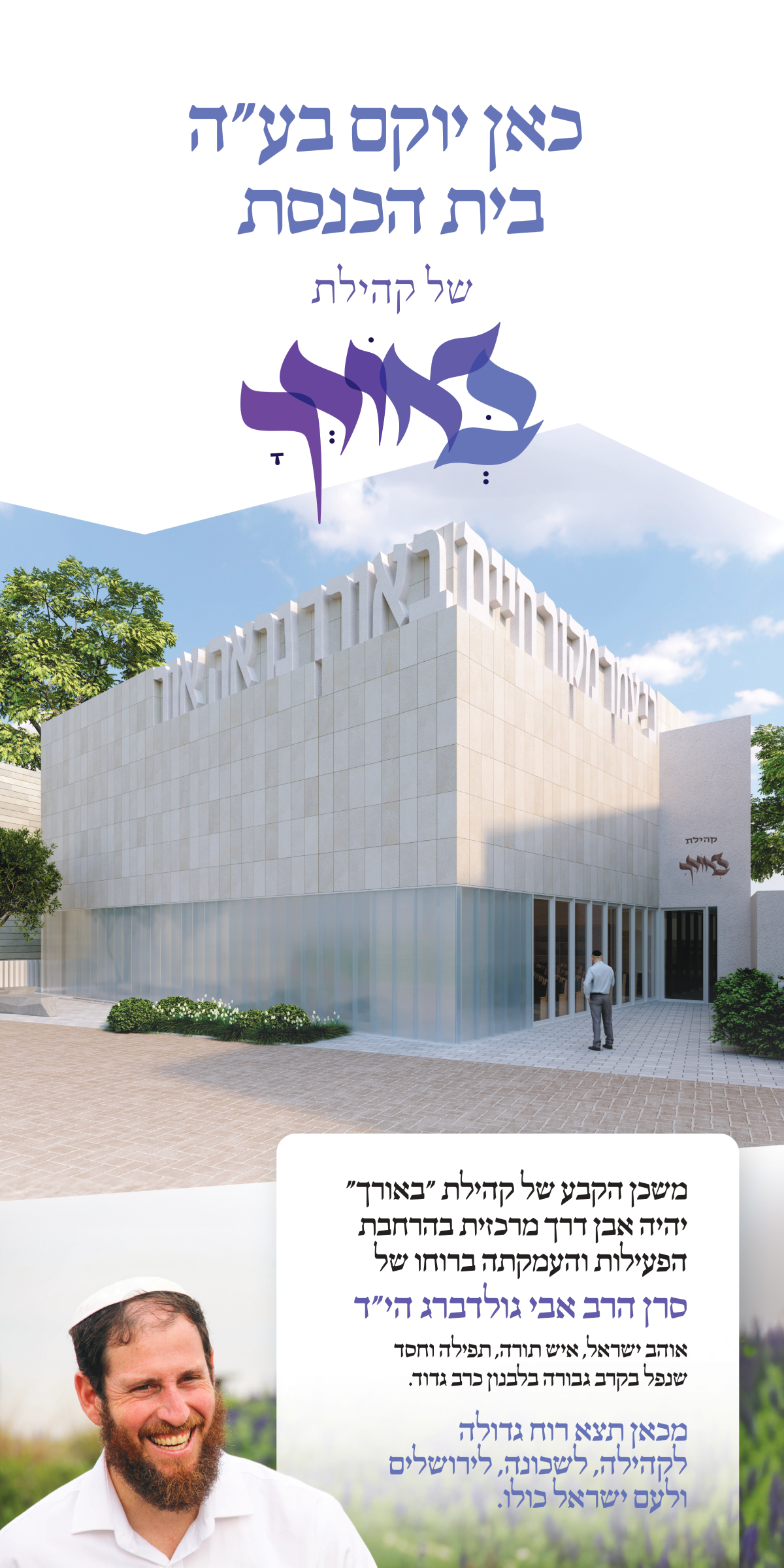 המבנה יהיה מקום תפילה ומקום להמשך הפעילויות אותם הוביל הרב אבי בתחומי הלימוד, החסד, החיבורים בין חלקי העם והנגינה.